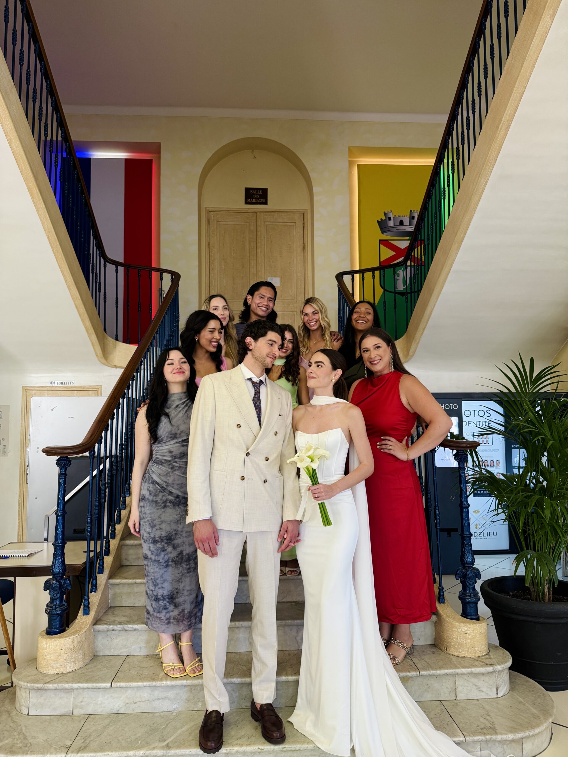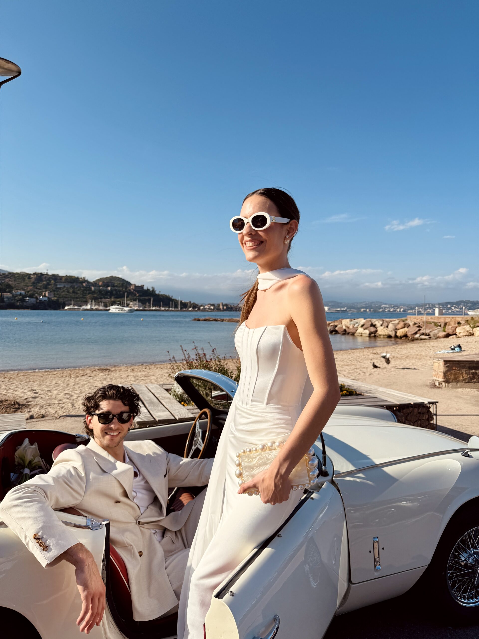 Am ersten Tag war das Standesamt – ganz intim, nur mit dem engsten Kreis. Ich hab Pricilla morgens gestylt: Sleek Ponytail, frisches Make-up und ein Hauch Glow. Danach fuhren wir mit einem Oldtimer durch die Sonne Südfrankreichs. Ja, das war genau so schön, wie es klingt 🙂