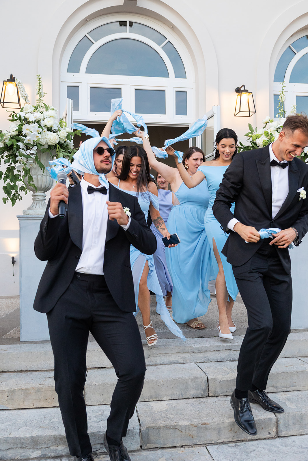 Vor dem Dinner sind Priscilla & Tim übrigens nicht einfach reingelaufen – Sie sind mit wehenden Tüchern, allen Bridesmaids und Groomsmen und einer Band reingerannt.