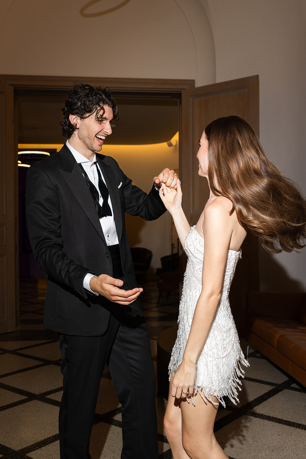 Beim Dinner wurde gelacht, geweint, getanzt. Danach haben wir das zweite Styling gemacht: Haare offen, Vorderpartie hinter die Ohren – ein Look, der perfekt zu ihrem kurzen, funkelnden Kleid gepasst hat.